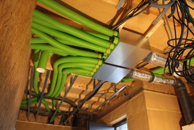 Ainsi, en parallèle du bureau d'étude, notre force se trouve dans notre équipe d'ouvriers qualifiés, spécialement formés et sensibilisés à la construction performante. Ils se chargent de tous les points sensibles de la construction passive : pose des menuiseries, installation de la ventilation double flux, plâtrerie-isolation et étanchéité à l'air.